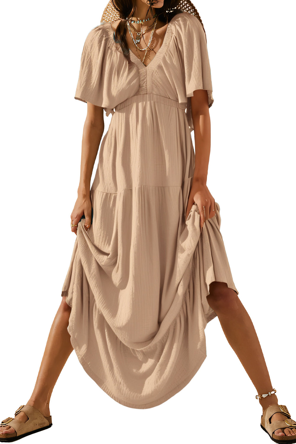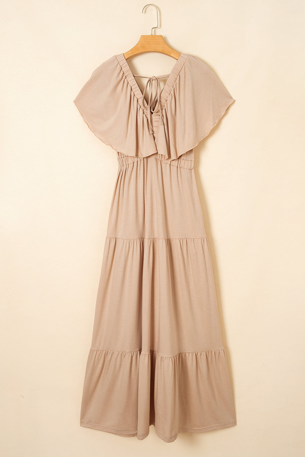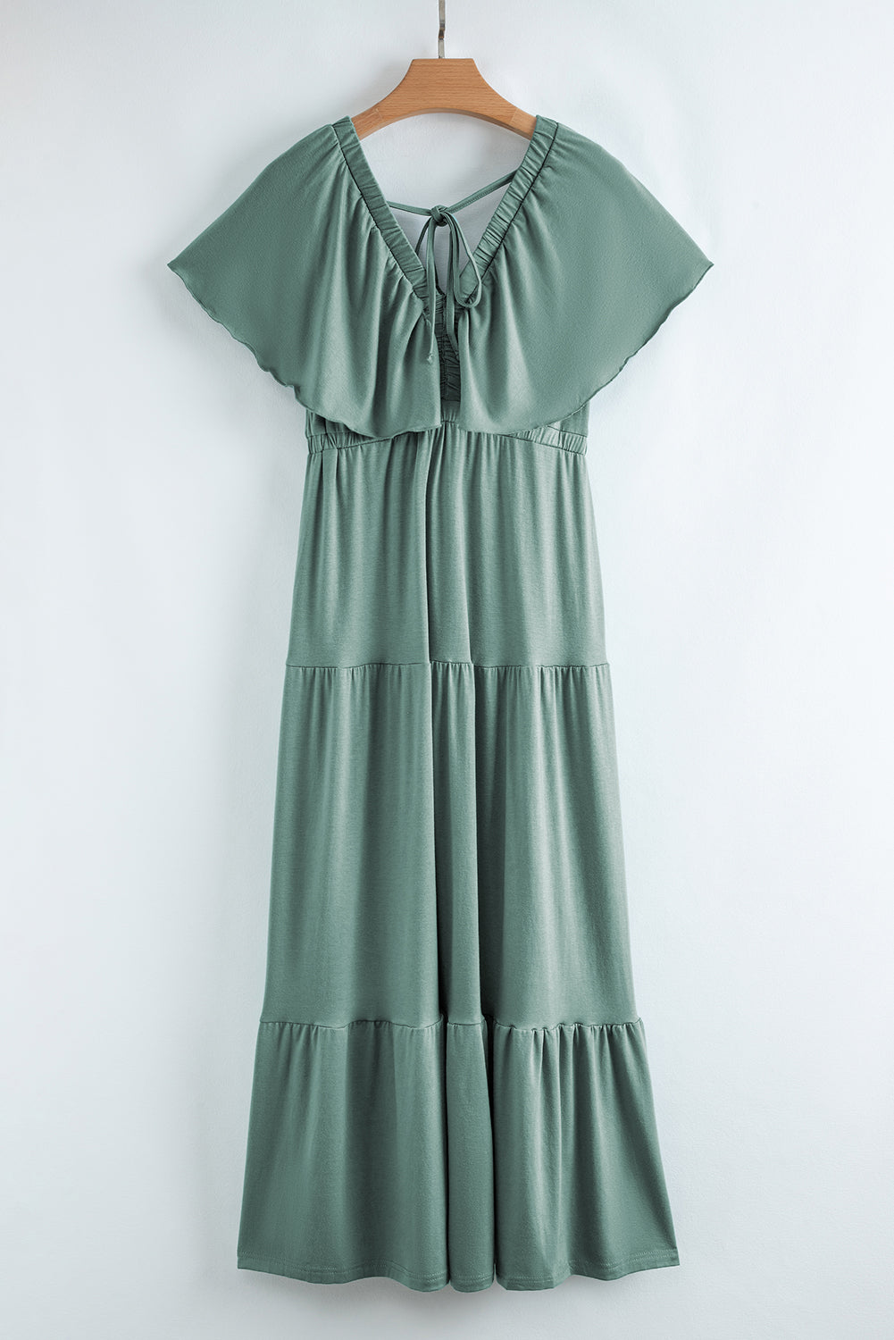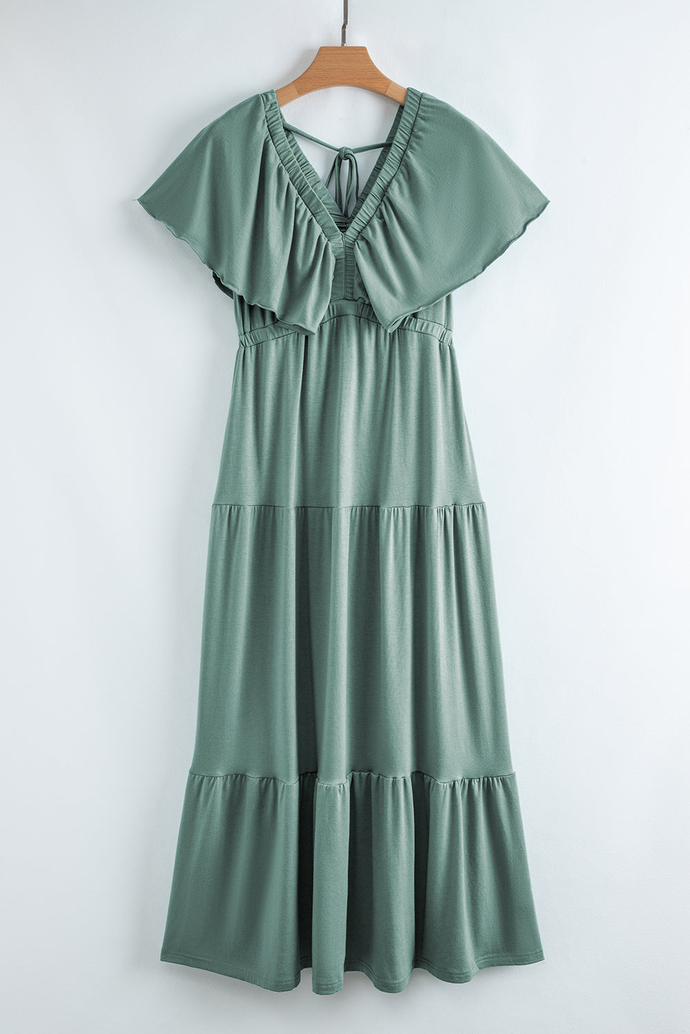 Textured V Neck Flutter Sleeve Ruffled Maxi Dress