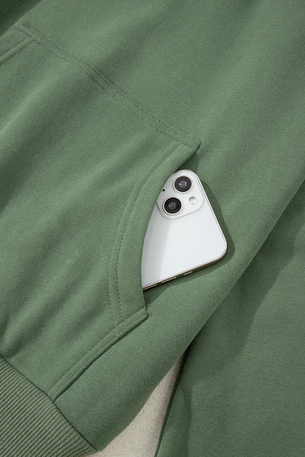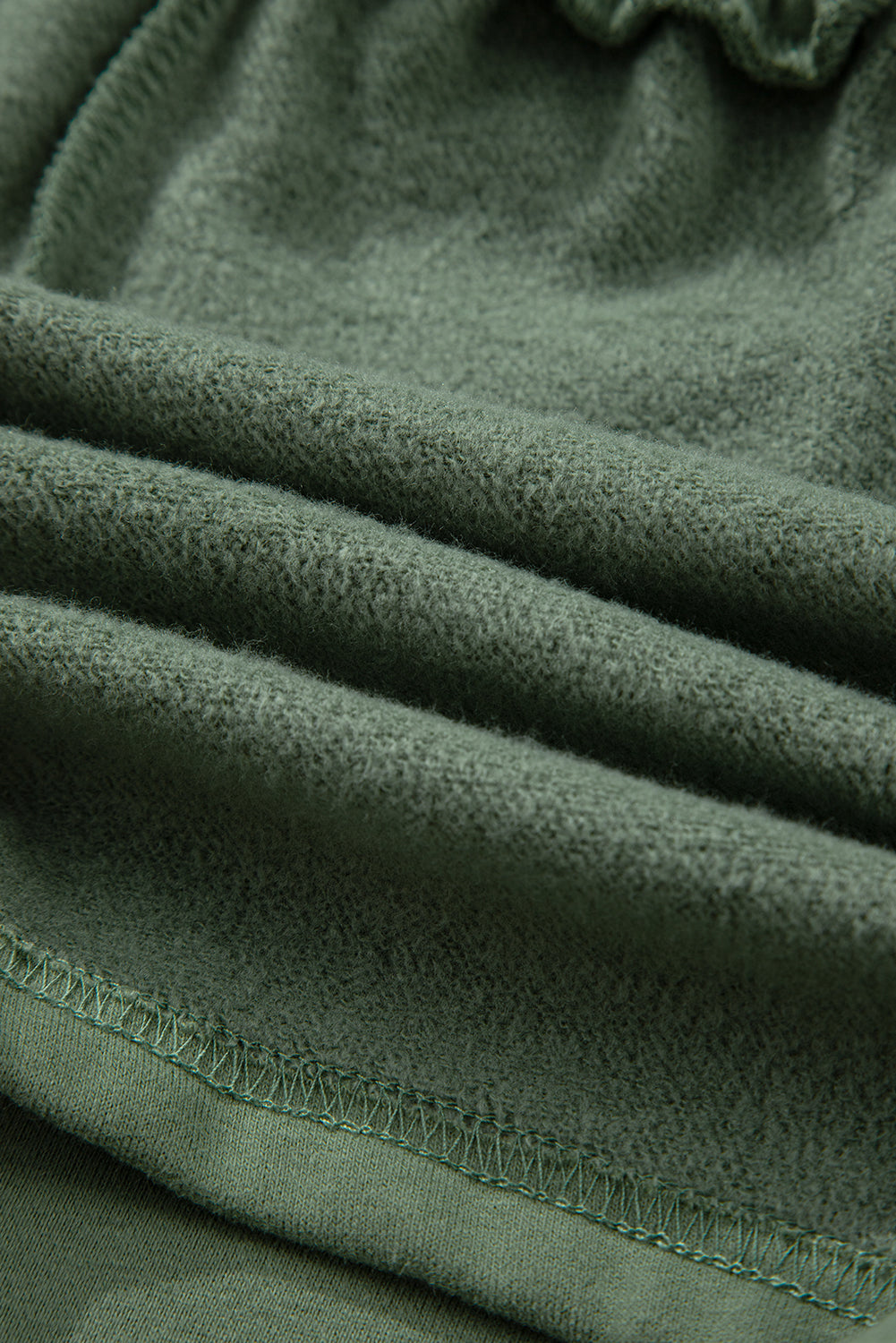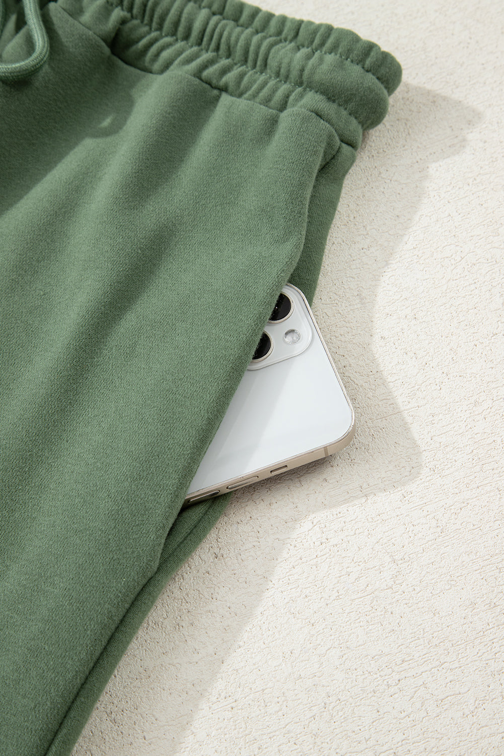 The relaxed two-piece set includes a hoodie pullover and casual shorts.