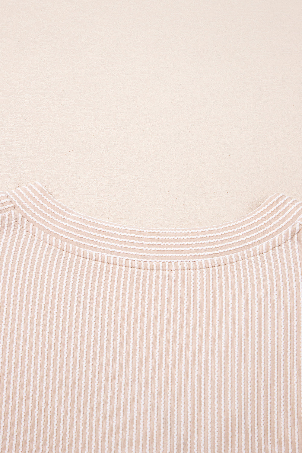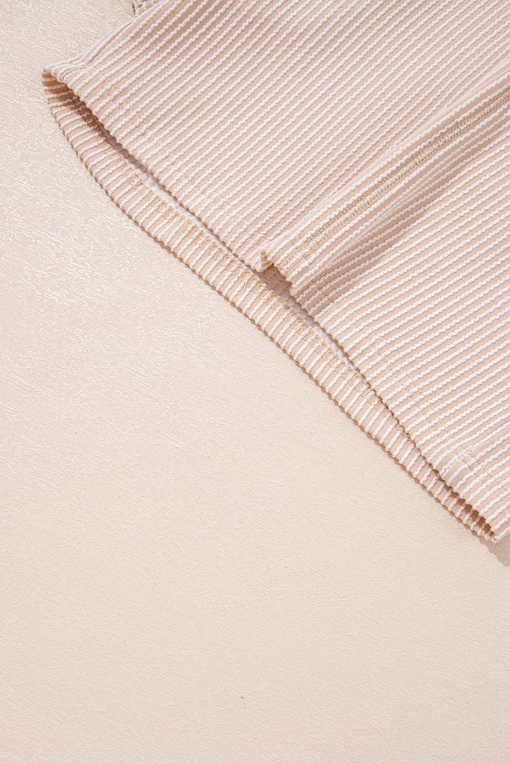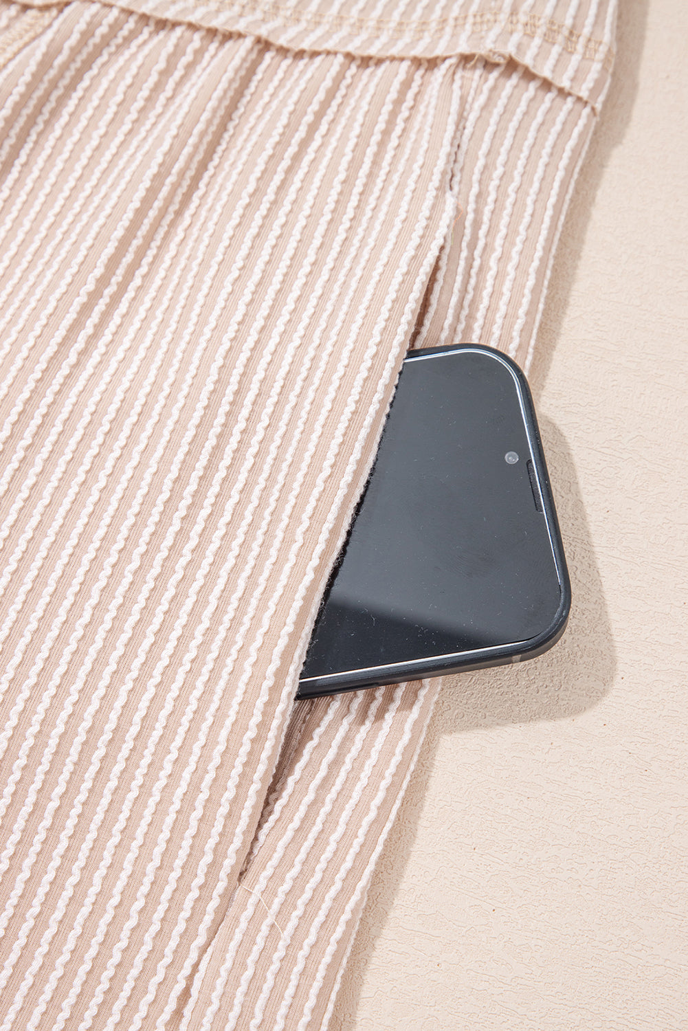 Parchment Spiral Ribbed Short Sleeve V Neck Buttoned Romper with Pocket