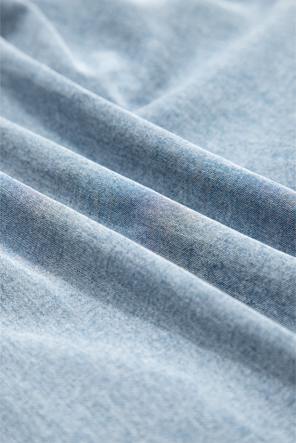Sleeveless design and chambray fabric offer a light, breezy feel.