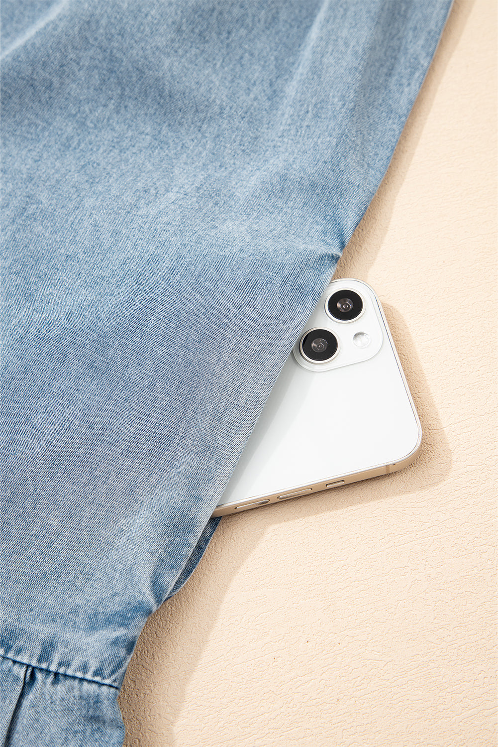 Real Teal Bowknot Neck Sleeveless Ruffled Chambray Dress