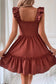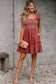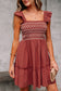 Red Sandalwood Geometric Stitch Shirred Bodice Ruffled Trim Sleeveless Mini Dress